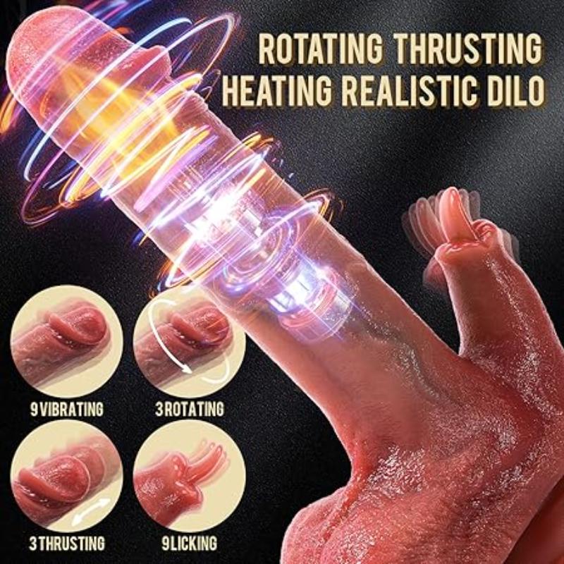 • Vibrador de pene térmico giratorio de empuje realista: este fabuloso consolador como juguete sexual femenino combina rotación, empuje, vibración, lengua vibratoria para el clítoris y calefacción térmica. Glande suave, textura real, lengua flexible, empuje y pene grueso, longitud de 23 cm, de inserción 18 cm, y diámetro de 4cm. Tiene una lengua adicional para tu clítoris. El consolador se calienta hasta 41°C de 5-10 minutos despues de activar la función, lo que te proporciona calidez como un pene real. • Tiene 9 vibraciones, 3 rotaciones, 3 de empuje y 9 lamidas de lengua que pueden estimular fácilmente tu punto G, clítoris y anal, y definitivamente te permitirá disfrutar del triple placer sexual • Puedes controlarlo de 3 formas: 1. Con los botones del dildo 2. Con control remoto (incluido) 3. Con una aplicación desde tu celular desde cualquier parte del mundo